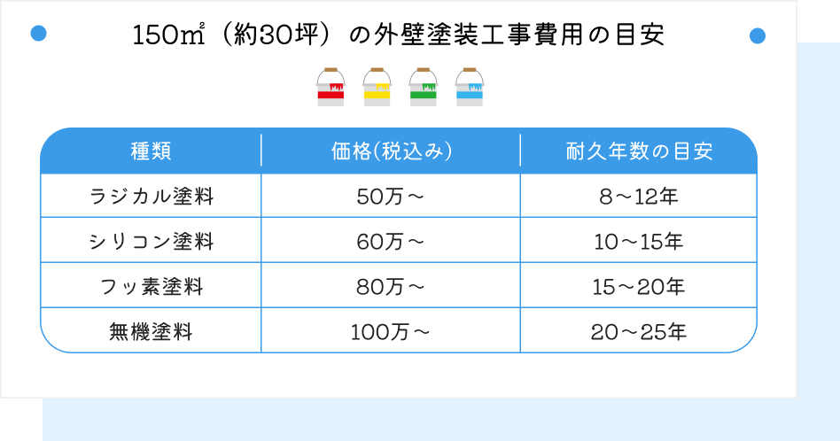 費用は建物の規模や塗料の種類、下地の状態によって異なりますので、あくまでも目安となります。正式な御見積は現地調査の上でお出しします。
